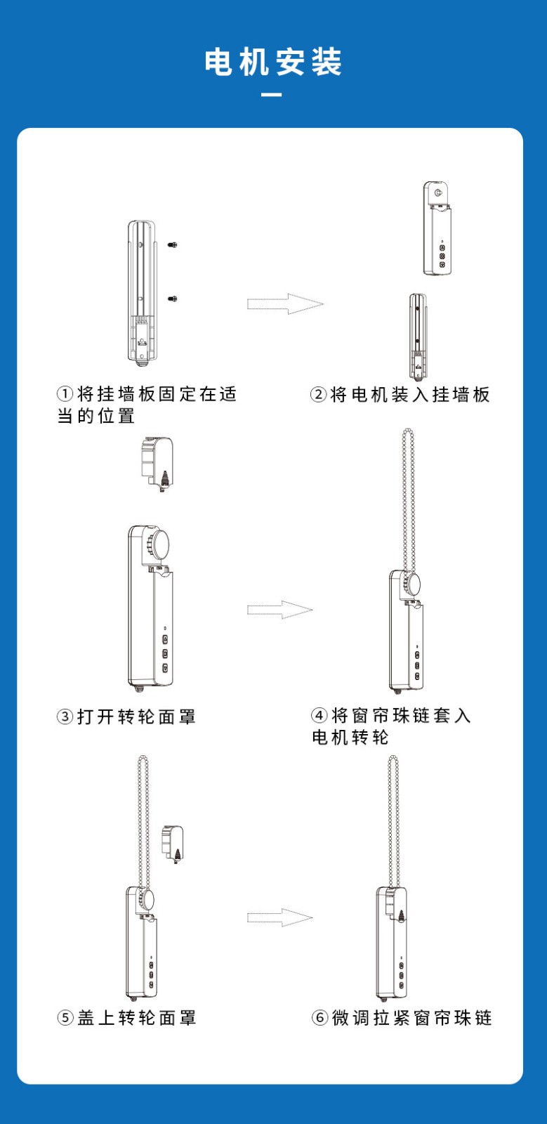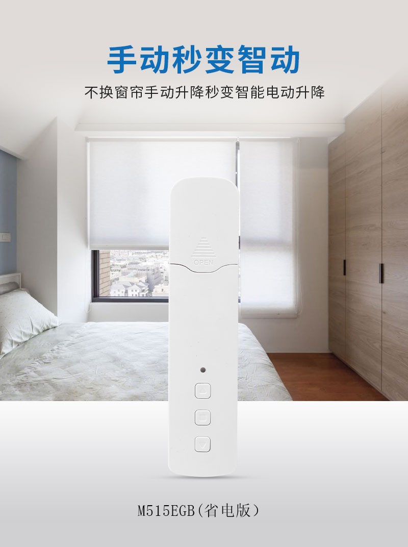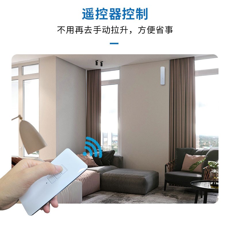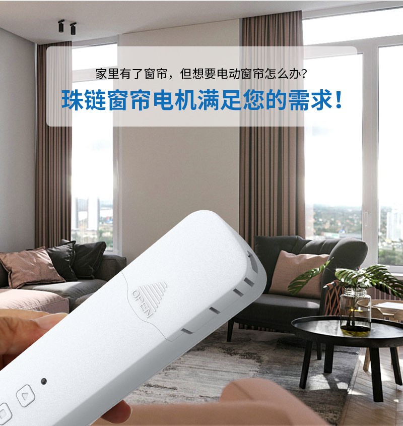 此產(chǎn)品適用于拉珠卷簾,可以把傳統(tǒng)的拉珠卷簾改變?yōu)橹悄茈妱哟昂煟惭b簡單,操作方便。安裝后可通過遙控器、語音、手機(jī)APP等控制窗簾升降。